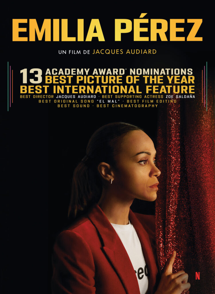 From renegade auteur, Jacques Audiard comes Emilia Pérez, an audacious fever dream that defies genres and expectations. Through liberating song and dance and bold visuals, this odyssey follows the journey of four remarkable women in Mexico, each pursuing their own happiness. The fearsome cartel leader Emilia (Karla Sofía Gascón) enlists Rita (Zoe Saldaña), an unappreciated lawyer stuck in a dead-end job, to help fake her death so that Emilia can finally live authentically as her true self. Written and directed by Audiard (Rust and Bone, A Prophet), the double Cannes-winning film also stars Selena Gomez, Adriana Paz, and Edgar Ramírez.